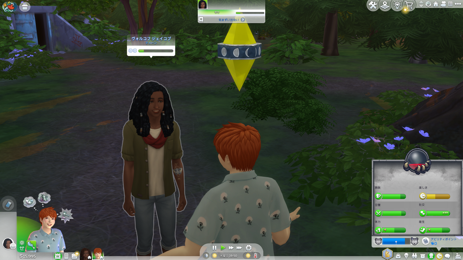 ジェイコブさんちのヴォルコフ君。このときはまだ友好度低いですがほっといたらどんどんあがっていってました。あの共同体のリーダー、クリストファーさんの息子さんですね。